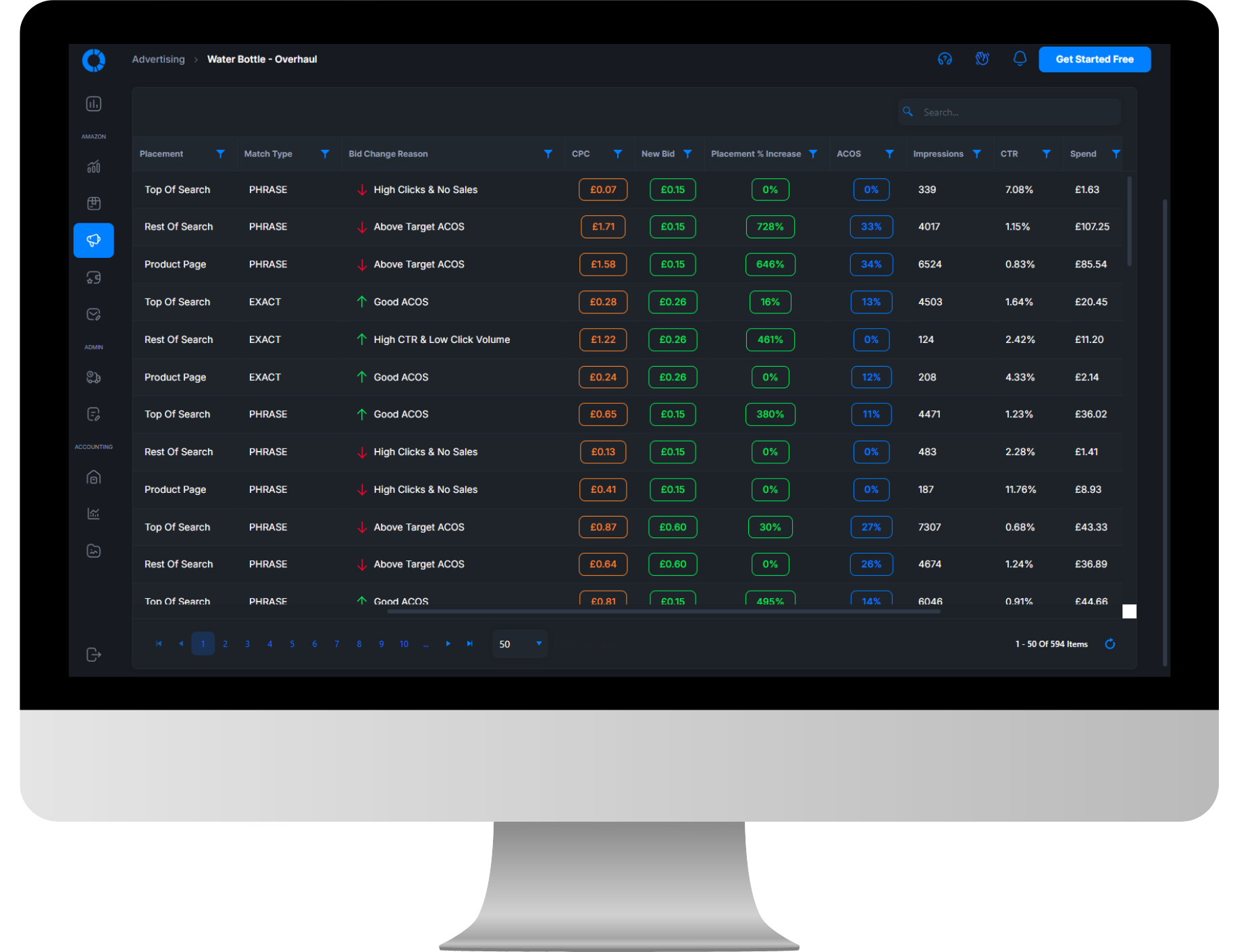 Our algorithm implements an advanced placement bidding strategy, emphasing top of search, product page or rest of search for each keyword, depending on how it performs best, allowing you to get every sale from every keyword whilst keeping your spend to a minimum