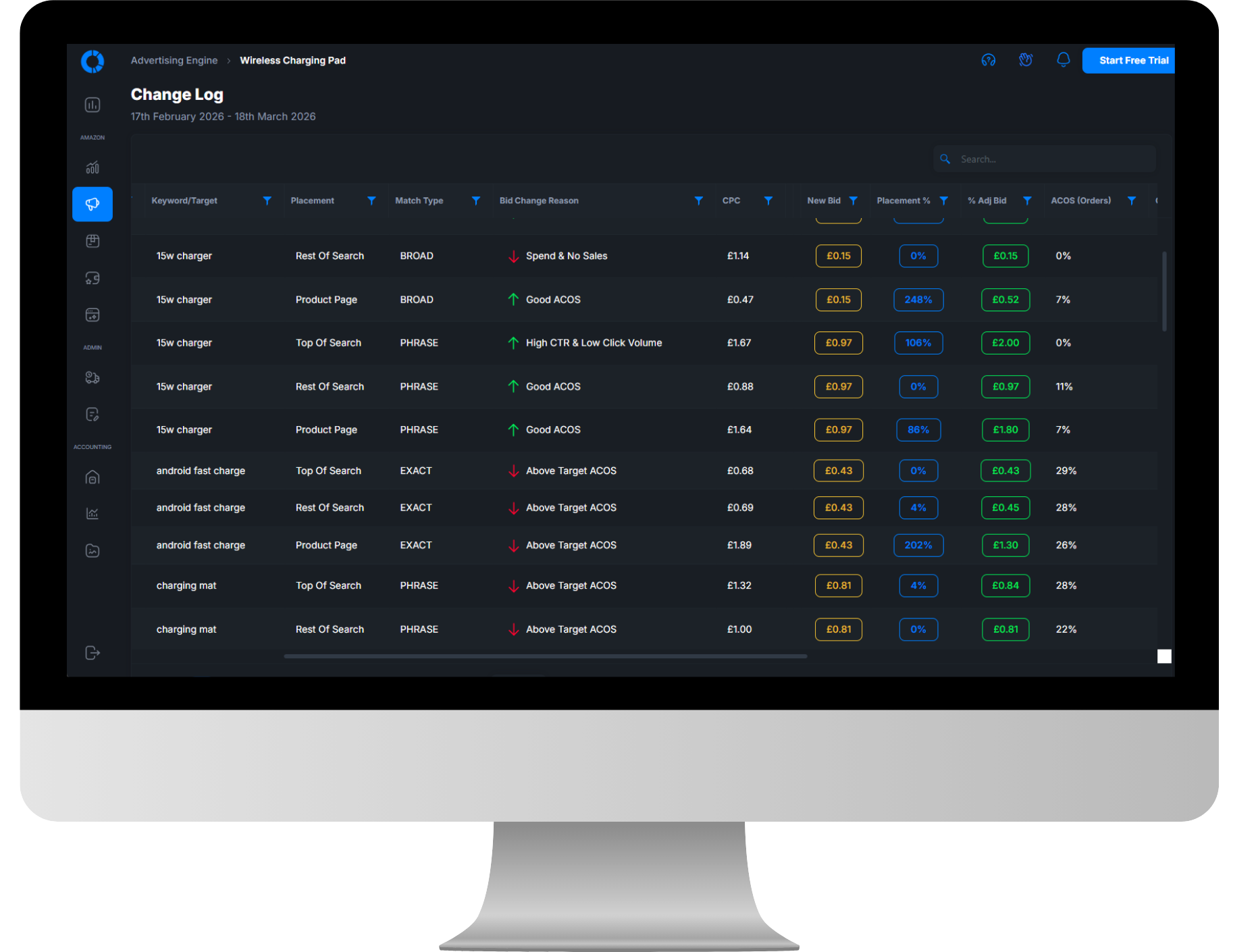 Our AI continuously analyses your real performance data to make precise bid and targeting decisions every day. It identifies where spend is being wasted, where opportunities exist, and adjusts accordingly without manual input. The result is a more efficient account, improved ACOS, and stronger, more consistent profit growth over time