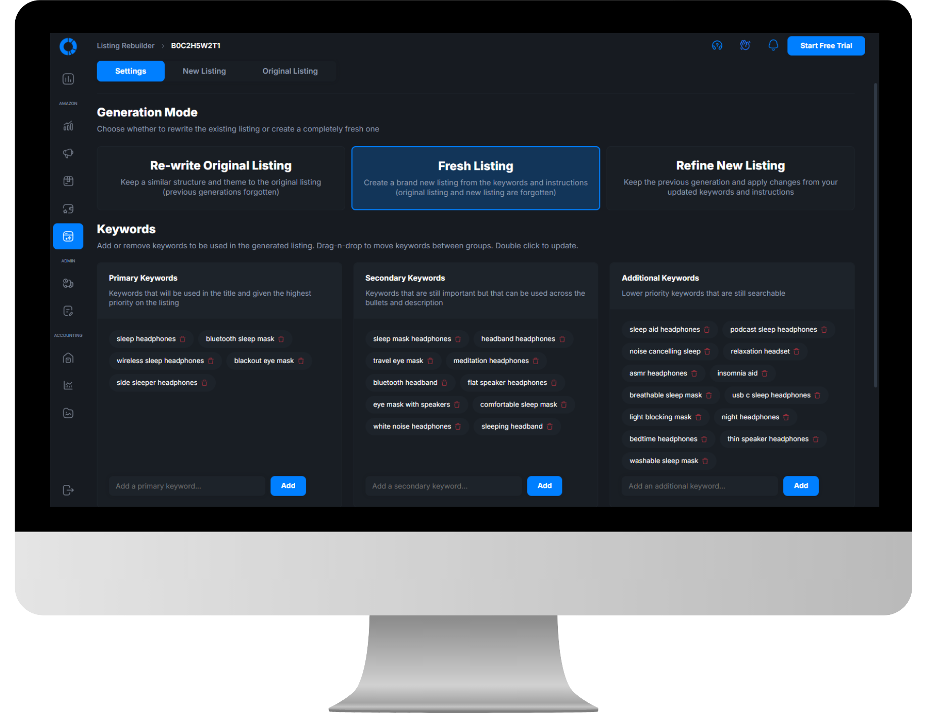 Extract keywords from your own or competitor listings, then generate optimised versions designed to rank and convert
