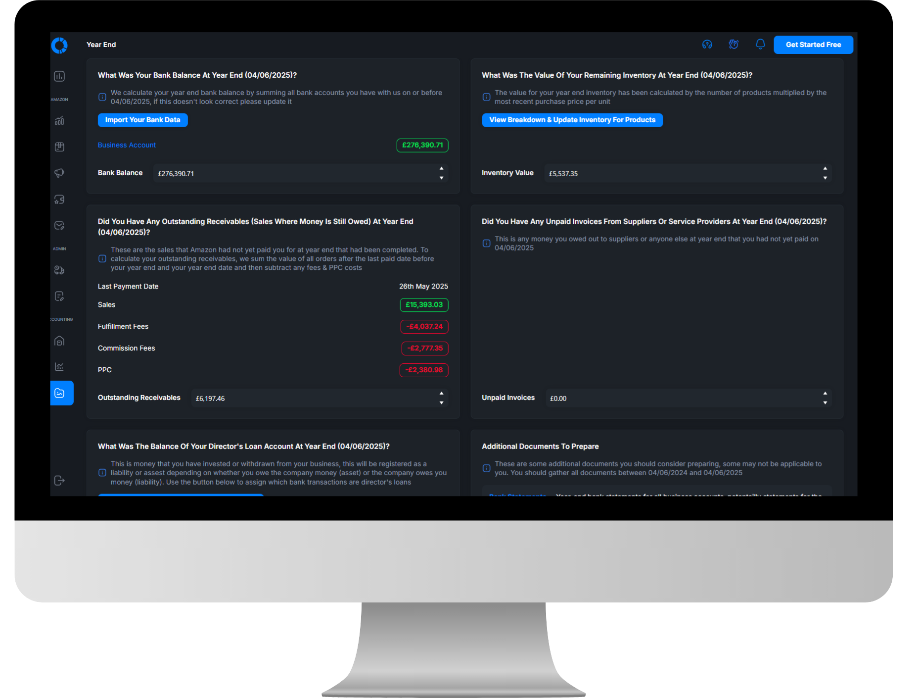 Using your Amazon and banking data, we answer some key questions that will appear on the balance sheet, another key component of a year end. Most of these answers we populate for you automatically and some we ask you to answer. Collecting this data for your accountant again saves them time and you money