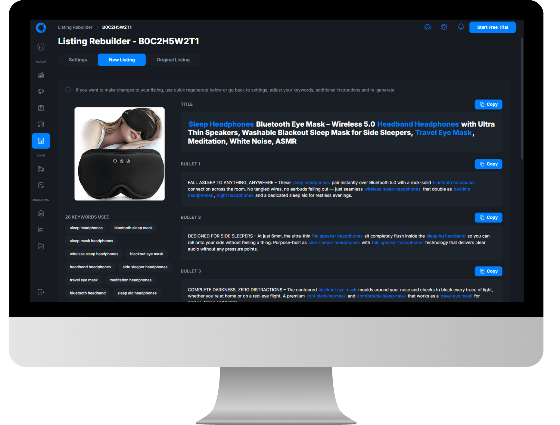 Extract keywords from your own or competitor listings, then generate optimised versions designed to rank and convert