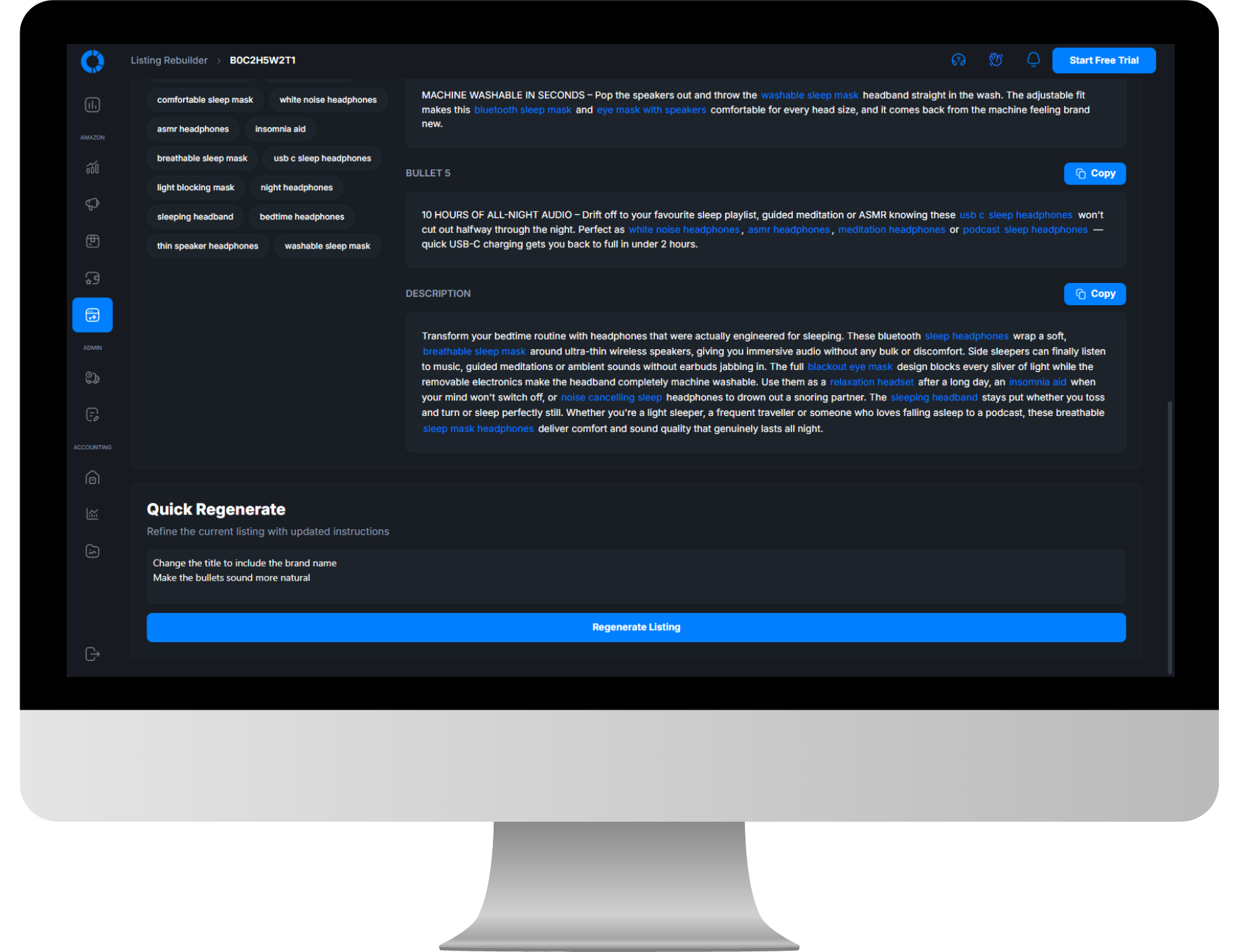 Adjust keywords, instructions and positioning to match your product, brand and goals. Refine the output and regenerate until your listing is exactly how you want it
