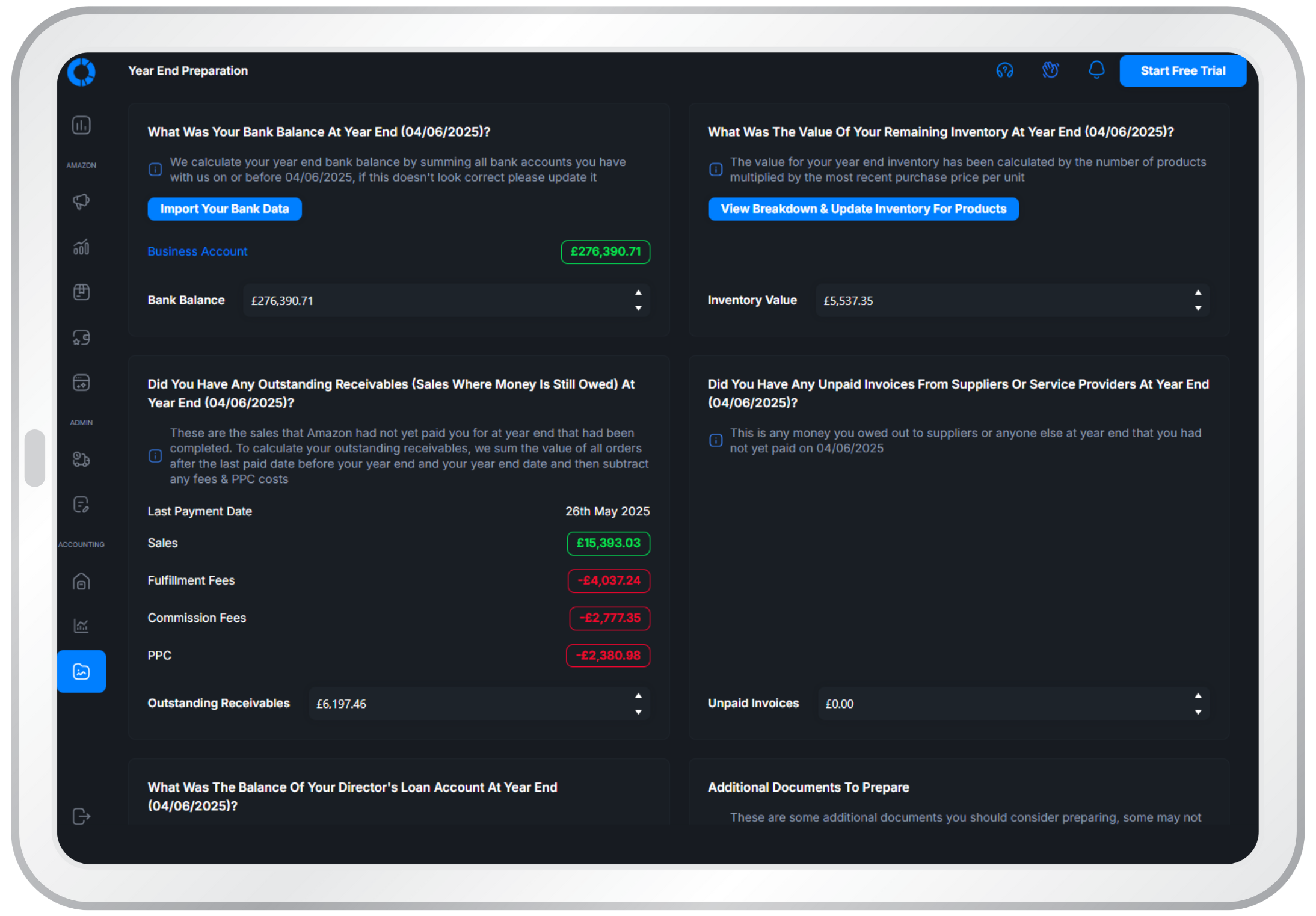 Using your Amazon and banking data, Osellpa helps you answer some key questions that will appear on the balance sheet, another key component of a year end. Most of the answers are populated automatically and some we ask you to answer. Collecting this data for your accountant again saves them time and you money